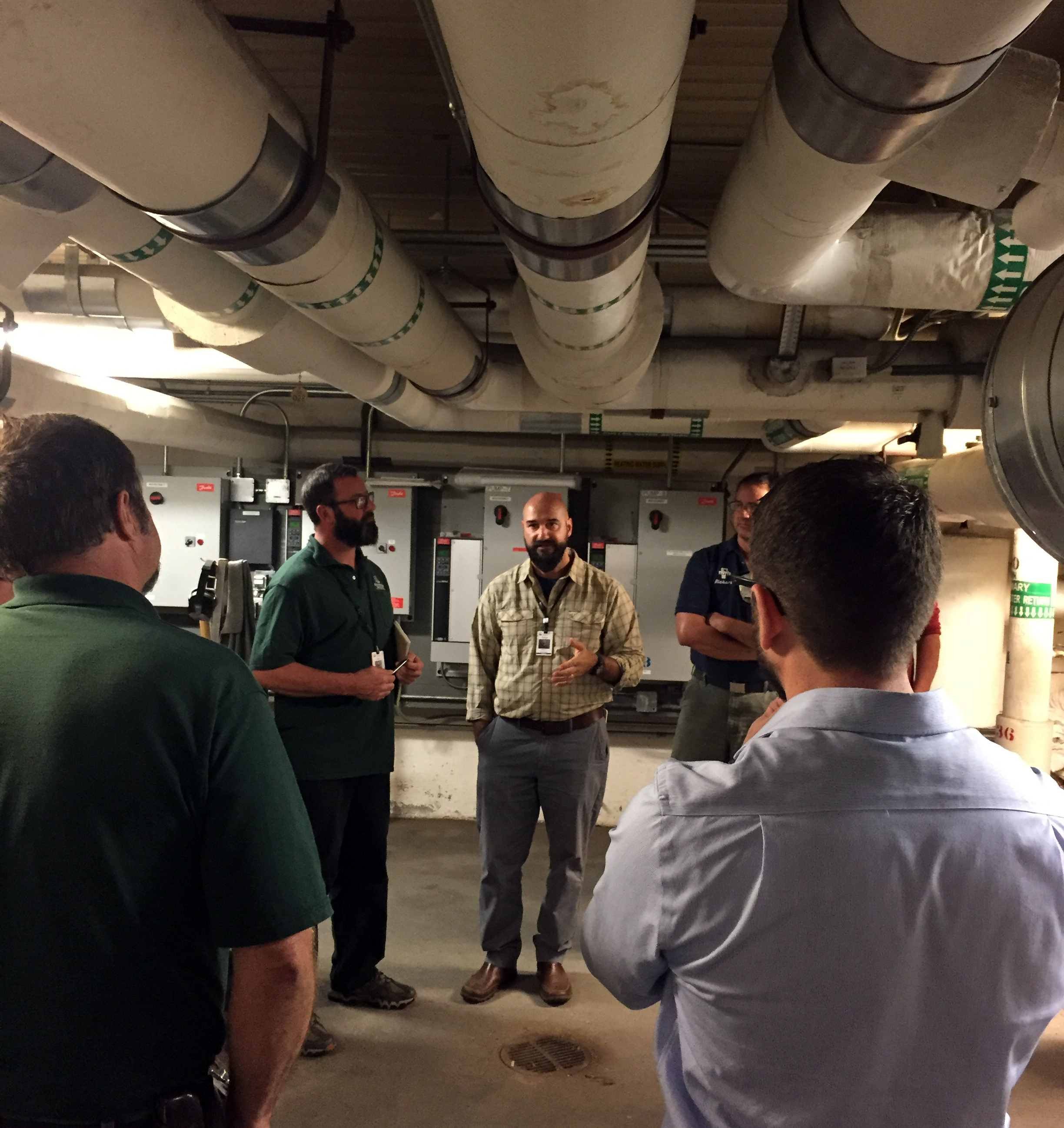 Gifford Facilities Manager Patrick Giordano conducts a tour with Continuous Energy Improvement (CEI) partners, including representatives from several Vermont hospitals, at Gifford Medical Center. The CEI partnership, facilitated by Efficiency Vermont, provides technical assistance, education, and support to develop a comprehensive approach to energy management in order to reduce waste, improve energy performance over time, and cut costs.