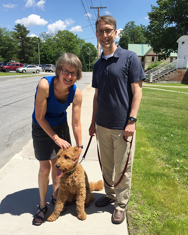 Dan and wife Jane walk their dog, Teddy, outside Gifford Medical Center a week after Dan’s hip replacement.